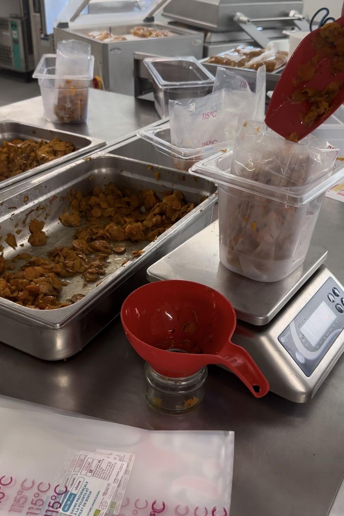 Notre volonté est de proposer une alimentation fraîche et savoureuse toute en couleur et en saveur. Nous avons donc fait le choix de ne pas stériliser nos repas afin qu'ils ne subissent aucun traitement thermique violent . Pour garantir la sécurité microbiologique sans utiliser ce mode de conservation et sans altérer les aliments, nous mettons nos repas dans des sacs sous vides adaptés qui seront donc pasteurisés puis refroidis.
